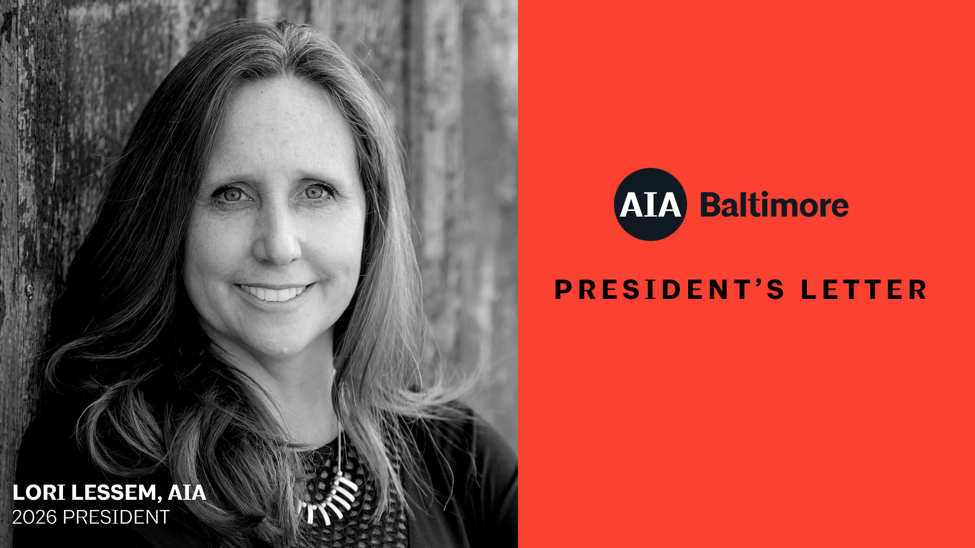 I hope this message finds you healthy and eager to embrace the opportunities that the new year will bring. My name is Lori Lessem, and it is a tremendous honor to begin my term as your AIA Baltimore President, and I look forward to collaborating with our 2026 Board to advance the goals of our chapter and our local architectural community.